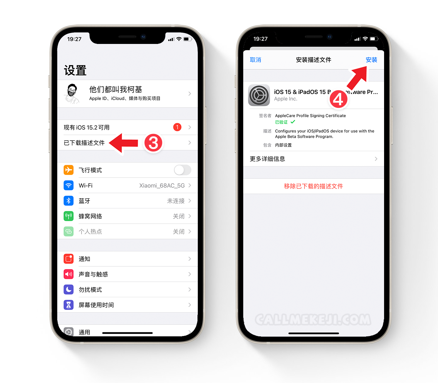 iOS14 及以下系统:依次打开「设置 - 通用 - 描述文件」点击描述文件「移除描述文件」然后重启手机即可。